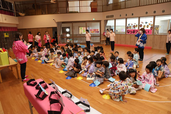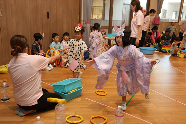令和7年度 夏祭り会 今年もみんなが楽しみにしていた夏祭り会を開催しました👘ワニワニパニックやたこやきビンゴ。ヨーヨー釣り、ひもクジなどのゲームをしました!!3時のおやつも4・5歳児さんは夏祭りメニューで、ソースせんべいとシャーベット、ヤングドーナツでした🍩お帰りの時間になると夏祭り会でGETしたお面やヨーヨーを持って嬉しそうに帰る子どもたちでした😆